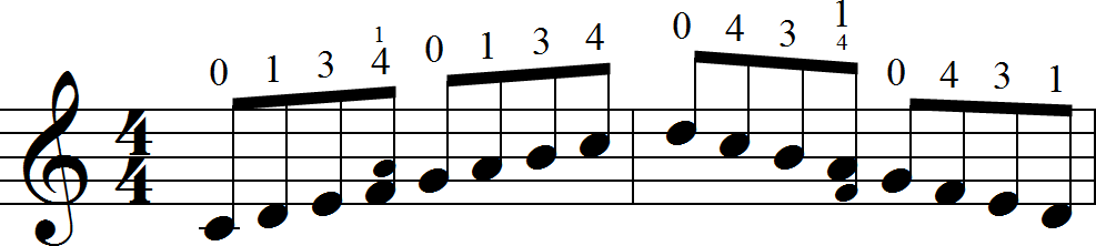 These four-note successions are called “tetrachords”. Tetrachords are the basis of the FFcP system. Check out the whole-steps and half-steps. They are the same for both tetrachords!